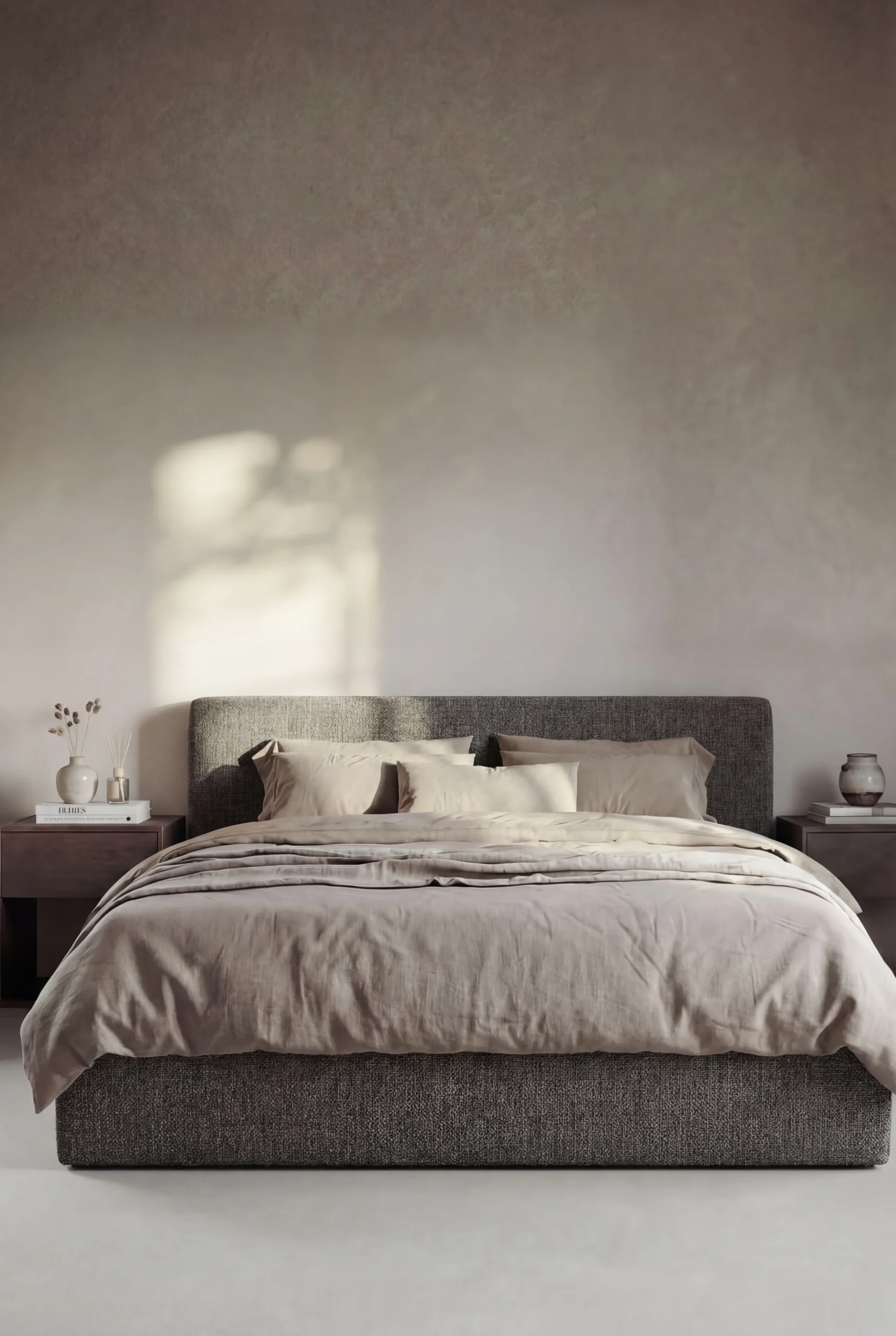 This upholstered bed brings calm refinement to your bedroom with its soft neutral palette, textured fabric finish, and clean modern silhouette that instantly elevates your space into a serene retreat. The gently padded headboard adds visual warmth and comfort, while the low profile design grounds the room with understated elegance, making your bedroom feel balanced, inviting, and effortlessly luxurious. Perfect for minimalist, modern, and contemporary interiors, this piece enhances your daily rest with a sense of tranquility, timeless style, and refined comfort that transforms your bedroom into a thoughtfully curated sanctuary.